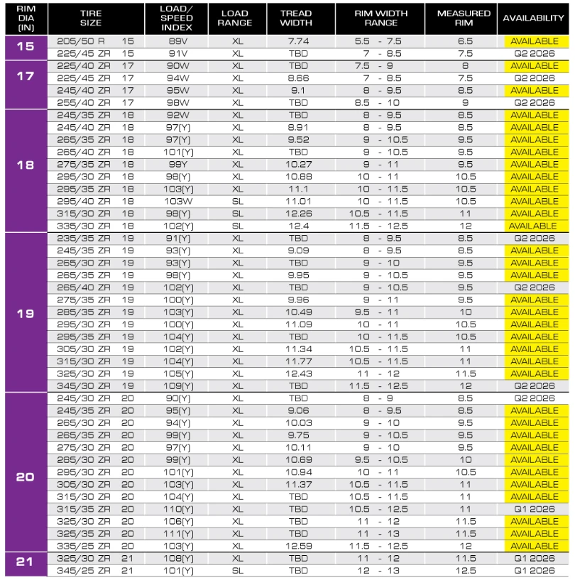 Quick view sku: H47724 255/40ZR17 TA PRO H47724 255/40ZR17 TA PRO EXTREME PERFORMANCE SUMMER | ULTRA-HIGH PERFORMANCE TrackAttack Pro Speed Rating: 98W Load Range: XL Tread Width: 9.0" Overall Dia.: 25.2" Tread depth: 5.3 Weight: 21.3 lbs. Appr. Rim Widths: 8.5-10.0" Measured Rim... MSRP: Now: $327.00 Compare Quick view sku: H47910 235/35ZR19 TA PRO H47910 235/35ZR19 TA PRO EXTREME PERFORMANCE SUMMER | ULTRA-HIGH PERFORMANCE TrackAttack Pro Speed Rating: (91Y) Load Range: XL Tread Width: 8.4" Overall Dia.: 25.8" Tread depth: 5.3 Weight: 20.6 lbs. Appr. Rim Widths: 8.0-9.5" Measured Rim... MSRP: Now: $416.00 Compare Quick view sku: H47926 265/40ZR19 TA PRO H47926 265/40ZR19 TA PRO TA PRO EXTREME PERFORMANCE SUMMER | ULTRA-HIGH PERFORMANCE TrackAttack Pro Speed Rating: (102Y) Load Range: XL Tread Width: 9.3" Overall Dia.: 27.6" Tread depth: 5.3 Weight: 24.2 lbs. Appr. Rim Widths: 9.0-11.0" Measured... MSRP: Now: $476.00 Compare Quick view sku: H47960 245/30ZR20 TA PRO H47960 245/35ZR20 TA PRO TA PRO EXTREME PERFORMANCE SUMMER | ULTRA-HIGH PERFORMANCE TrackAttack Pro Speed Rating: (95Y) Load Range: XL Tread Width: 8.7" Overall Dia.: 27.1" Tread depth: 5.3 Weight: 22.8 lbs. Appr. Rim Widths: 8.0-9... MSRP: Now: $499.00 Compare Quick view sku: H47994 325/30ZR21 TA PRO H47994 325/30ZR21 TA PRO EXTREME PERFORMANCE SUMMER | ULTRA-HIGH PERFORMANCE TrackAttack Pro Speed Rating: 108Y Load Range: XL Tread Width: 11.6" Overall Dia.: 29.2" Tread depth: 5.3 Weight: 28.7 lbs. Appr. Rim Widths: 11.0-12.0" Measured Rim... MSRP: Now: $696.00 Compare Quick view sku: H47954 345/30ZR19 TA PRO H47954 345/30ZR19 TA PRO EXTREME PERFORMANCE SUMMER | ULTRA-HIGH PERFORMANCE TrackAttack Pro Speed Rating: (109Y) Load Range: XL Tread Width: 12.4" Overall Dia.: 27.5" Tread depth: 5.3 Weight: 28.0 lbs. Appr. Rim Widths: 11.5-12.5" Measured Rim... MSRP: Now: $709.00 Compare Quick view sku: H47984 315/35ZR20 TA PRO H47984 315/35ZR20 TA PRO EXTREME PERFORMANCE SUMMER | ULTRA-HIGH PERFORMANCE TrackAttack Pro Speed Rating: (110Y) Load Range: XL Tread Width: 11.0" Overall Dia.: 29.0" Tread depth: 5.3 Weight: 27.9 lbs. Appr. Rim Widths: 10.5-12.5" Measured Rim... MSRP: Now: $742.00 Compare Quick view sku: H47998 345/25ZR21 TA PRO H47998 345/25ZR21 TA PRO EXTREME PERFORMANCE SUMMER | ULTRA-HIGH PERFORMANCE TrackAttack Pro Speed Rating: 104Y Load Range: XL Tread Width: 12.7" Overall Dia.: 28.3" Tread depth: 5.3 Weight: 28.4 lbs. Appr. Rim Widths: 12.0-13.0" Measured Rim... MSRP: Now: $827.00 Compare Compare Selected × OK